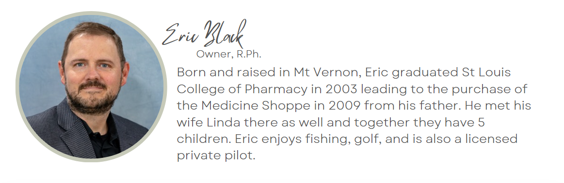 Locally owned and operated since 1984, The Medicine Shoppe was opened by Richard Black R.Ph and in 2009 was purchased by son Eric Black R.Ph.